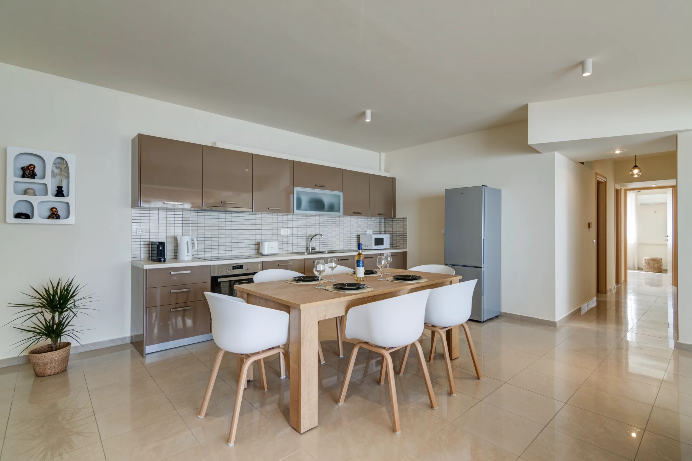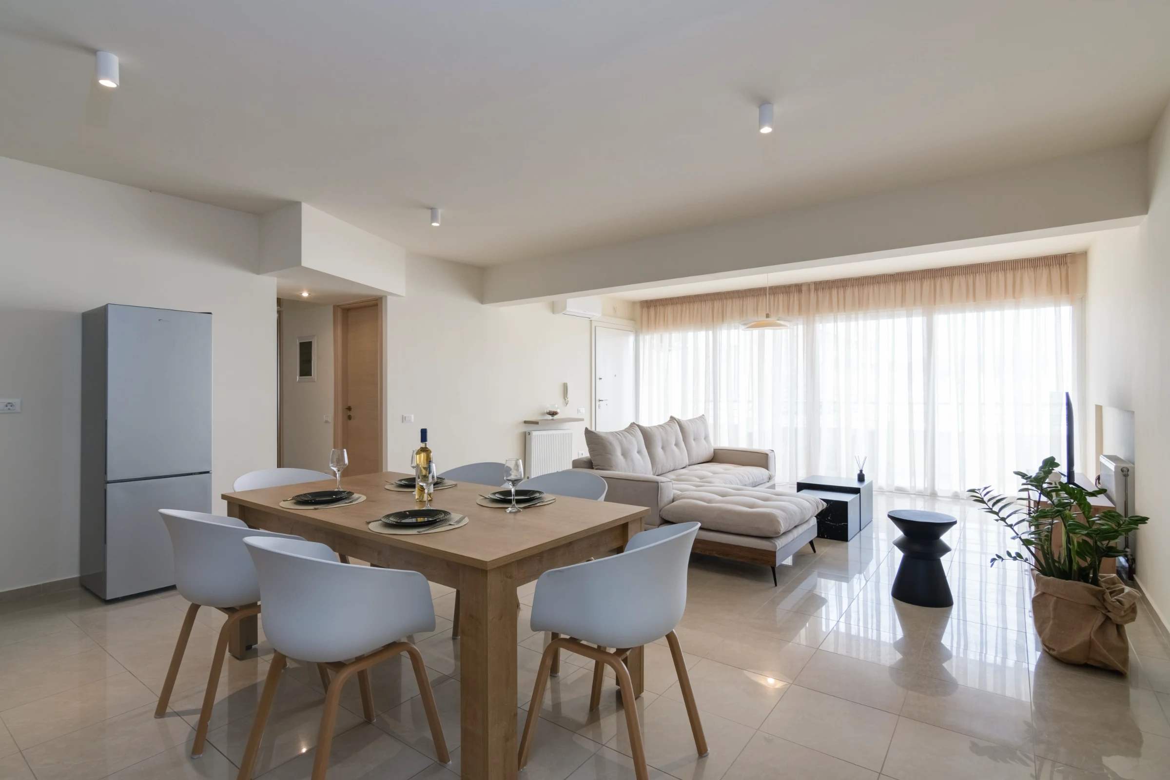 The accommodation consists of 3 bedrooms, 2 bathrooms, 1 storage room, 1 living room-kitchen area and 2 balcony with view to the sea and the city.